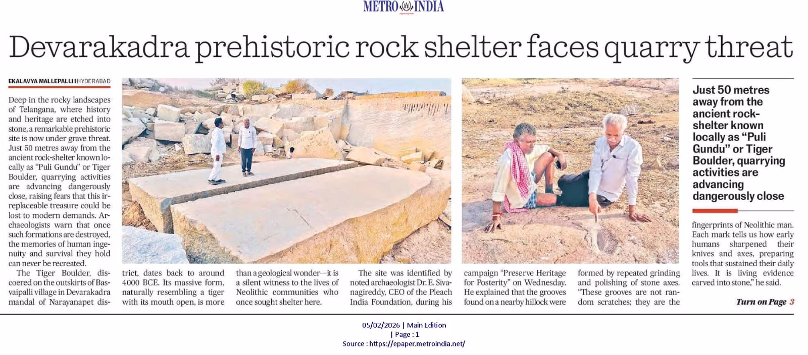 Prehistoric rock shelters at Puligundu and Nidigundu, dating to around 4000 BCE (Neolithic period), were examined at Nandipet village, Devarakadra Mandal, Mahabubnagar District, Telangana.
